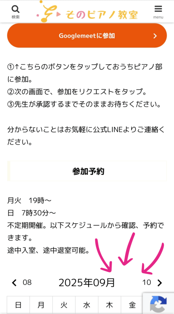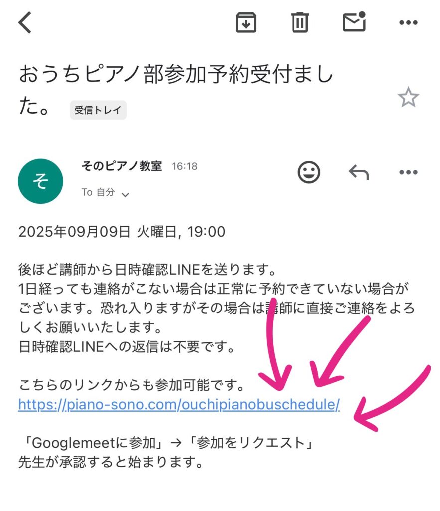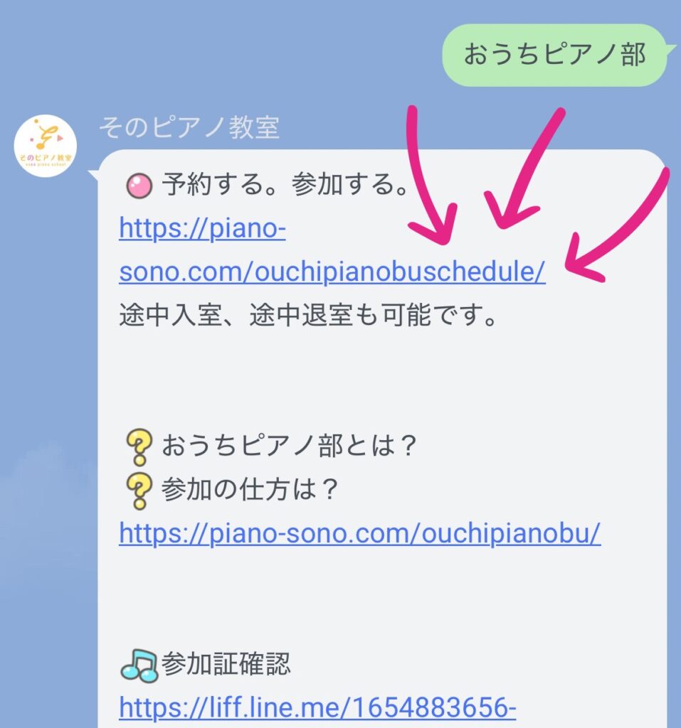 「おうちピアノ部」→「予約する。参加する。」のリンクをタップ。