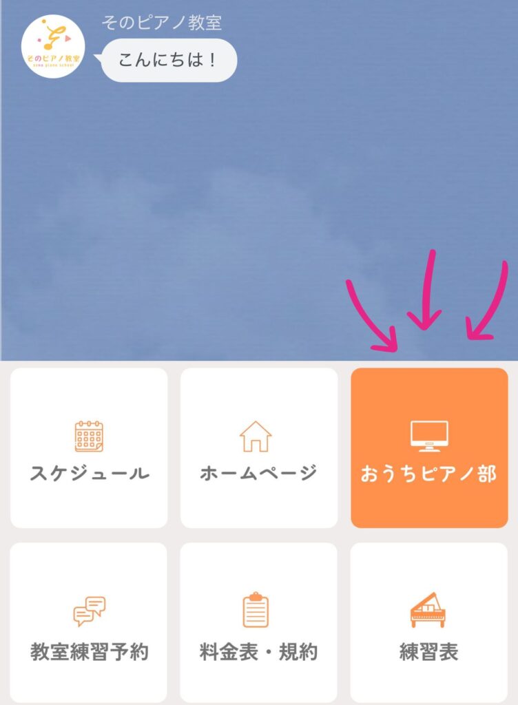 公式LINEのメニューバーから右上の「おうちピアノ部」をタップ。
